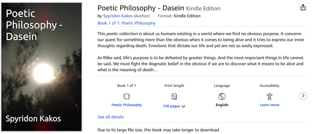 The first collection of Poetic Philosophy poems under the title ‘Dasein’ is published and is currently available in Kindle as an e-book at https://www.amazon.com/Poetic-Philosophy-Dasein-Spyridon-Kakos-ebook/dp/B0GDSC94BG/